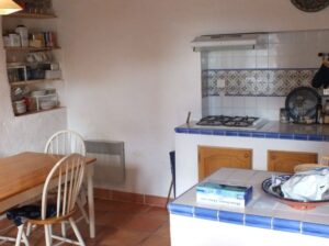 Maison sur 3 niveaux avec au rez de chaussée, la cuisine et l’espace repas, au premier étage le séjour avec TV et Poële à bois et au deuxième étage la chambre avec lit de 160×200, la salle d’eau et les WC.