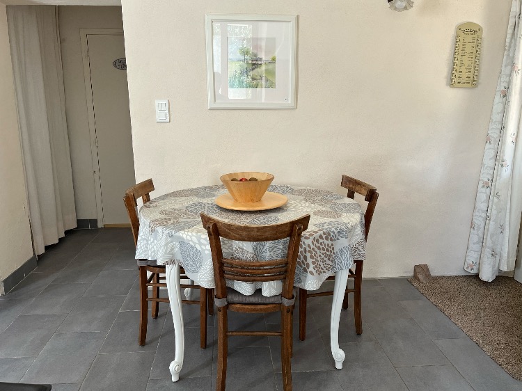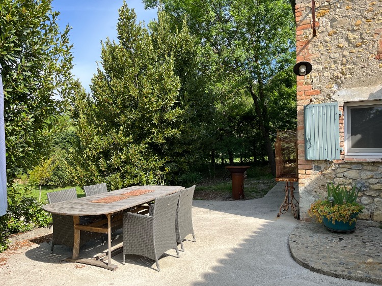 Une table en fer forgé ainsi que des chaises de jardin et 2 chaises longues sont installées pour des moments de détente garanti.