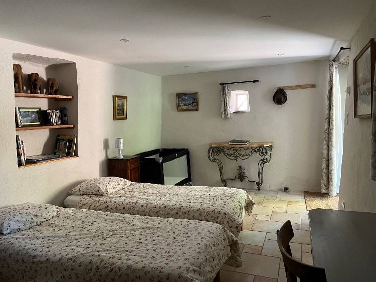 Il y a une GRANDE CHAMBRE de 15 m2 avec un lit double de 1m60 / 2m séparable en 2 lits de 80cm de large avec accès direct et de plein pied à une terrasse en partie couverte et une autre terrasse pour se prélasser au soleil.
