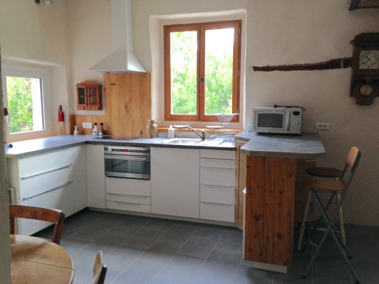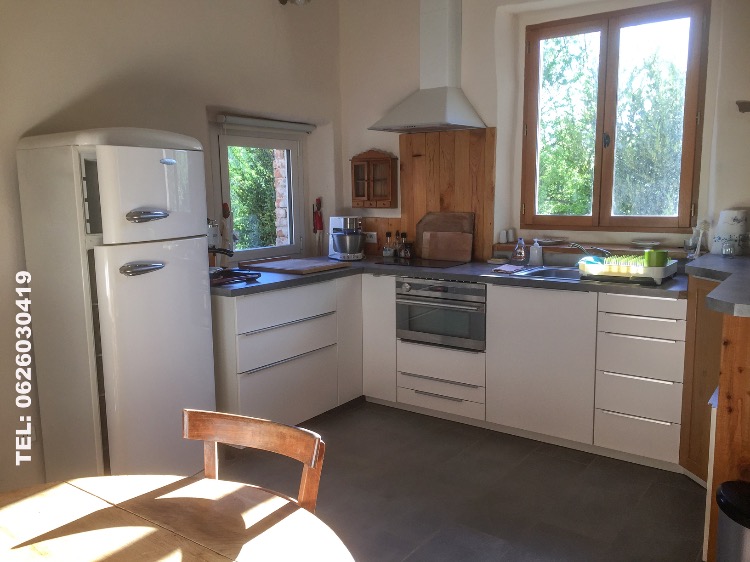 Dans LA PIECE A VIVRE , vous disposerez également d ‘ UNE CUISINE EQUIPEE et d’un joli salon l’ensemble de 32 m2 dans l’esprit du pays avec des pierres apparentes et un poêle à bois pour les soirées d’hiver.