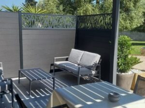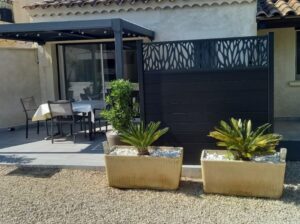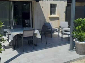 Terrasse extérieure de 20m² à moitié couverte par une pergola bioclimatique + salon de jardin + table avec 4 chaises