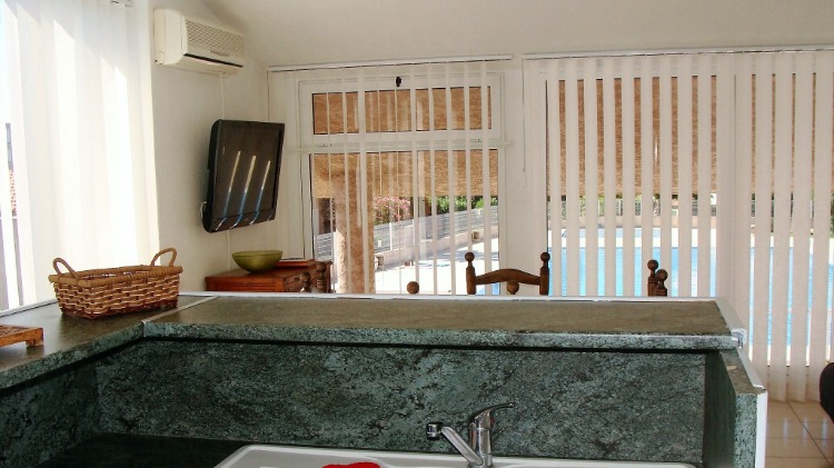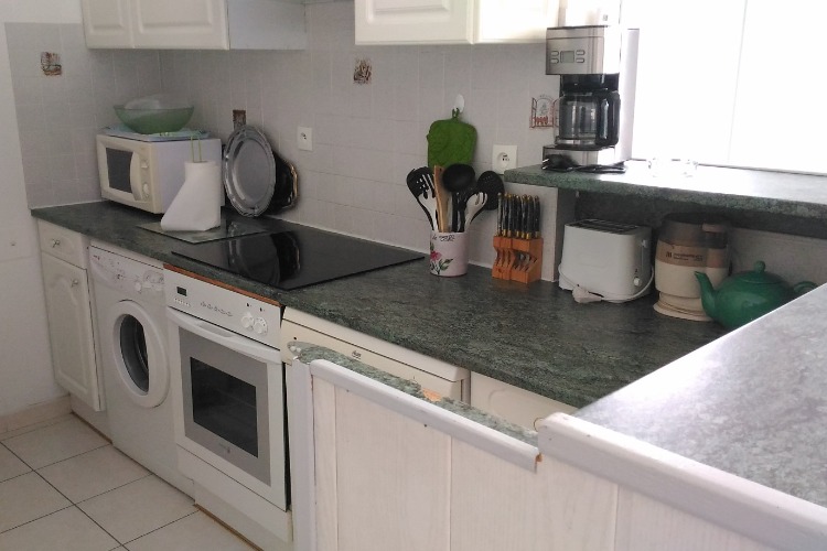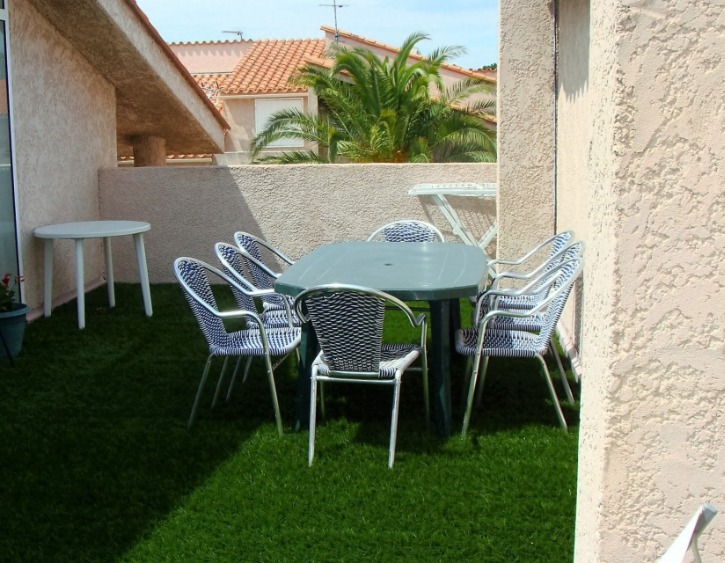 La terrasse à ciel ouvert du séjour fait 33 m2. Elle est équipée d’un barbecue à charbon, de transats et d’un salon de jardin abrité sous un store en toile. C’est une véritable salle à manger extérieure. Il n’y a aucun vis-à-vis direct. Le canapé du séjour climatisé permet le couchage de deux personnes (couchage en 140). Le séjour est équipé d’un meuble de rangement, d’une TV et d’une table avec huit chaises. Le coin cuisine du séjour est équipé d’un lave-vaisselle, d’un lave-linge, d’un réfrigérateur avec congélateur, de plaques à induction, d’un four, d’un micro-onde, d’une cafetière électrique, d’un grille-pain, d’une bouilloire électrique, d’une plancha électrique ainsi que de toute la vaisselle nécessaire.