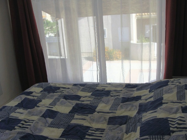 La seconde chambre à lit double (lit en 140) donne sur la place centrale de la résidence. Sa porte-fenêtre ouvre également sur la seconde grande terrasse équipée de transats. Elle possède une armoire.