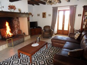 Canapé d’angle avec méridienne, fauteuils, table de salon, bureau et son fauteuil, bibliothèque, TV satellite TNT avec radios, magnétoscope.