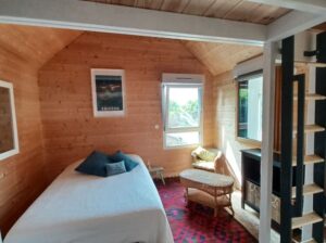 Voir les 13 photosPetite maison en ossature bois très lumineuse refaite à neuf , exposée plein Sud sur un terrain de 600m2 dans quartier résidentiel très calme. Elle dispose d’une pièce à vivre ,coin cuisine toute équipée à neuf avec mange debout et coin repas. Attenante une chambre de 20m2 équipée d’une chambre avec lit double ,salle d’eau et WC séparés . Au dessus une petite mezzanine où sont installés 2 lits simples. Hauteur maximum 165cm , accès par échelle amovible de bonne qualité .La Cabane a un accès direct sur le jardin et la petite terrasse , vue sur la campagne.