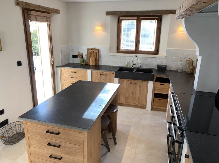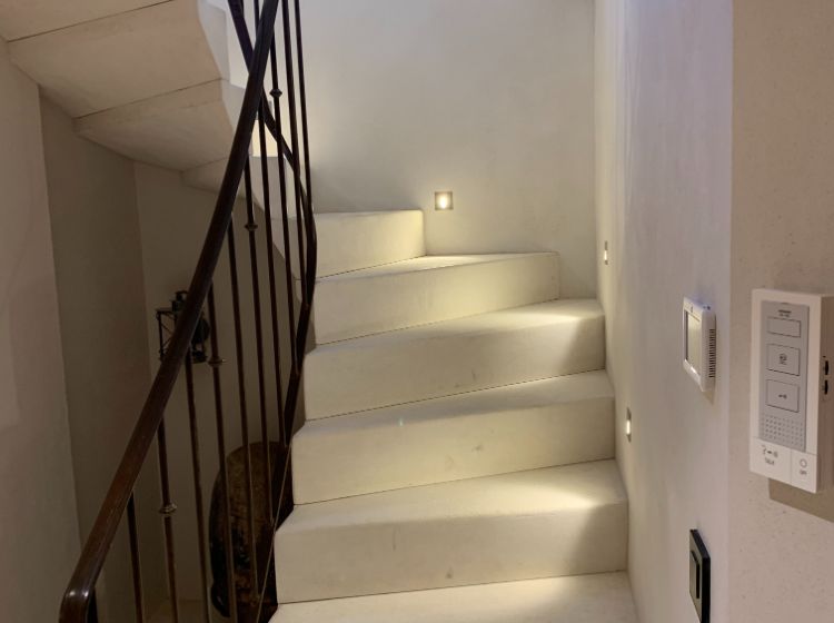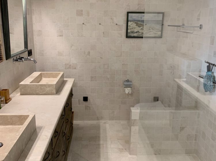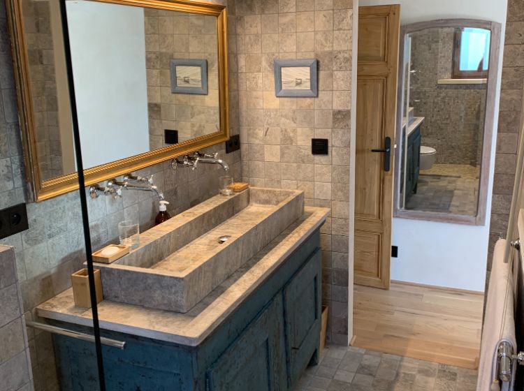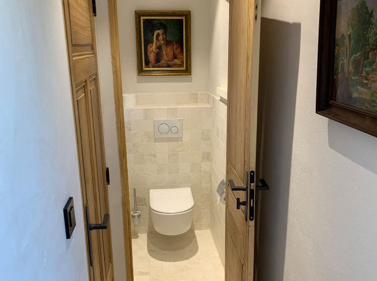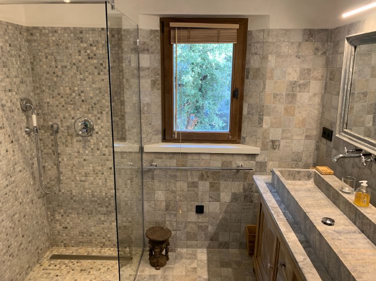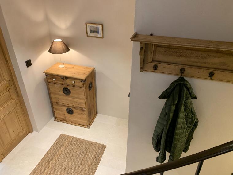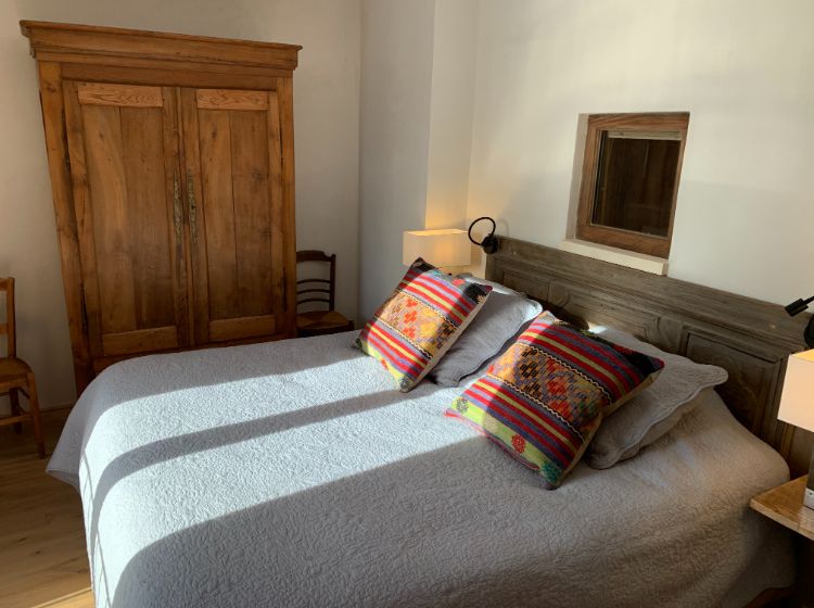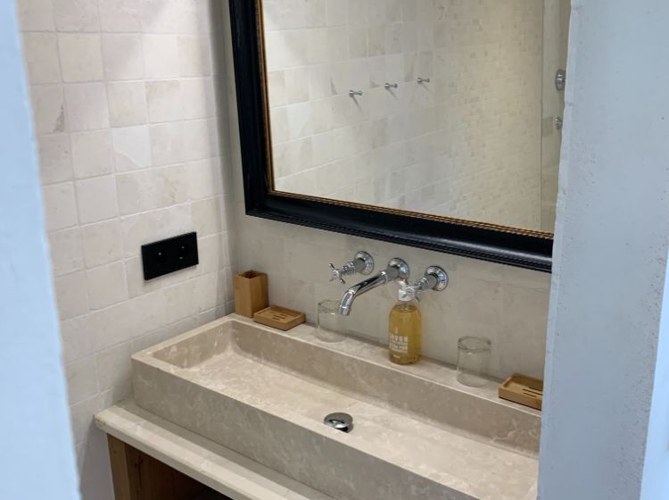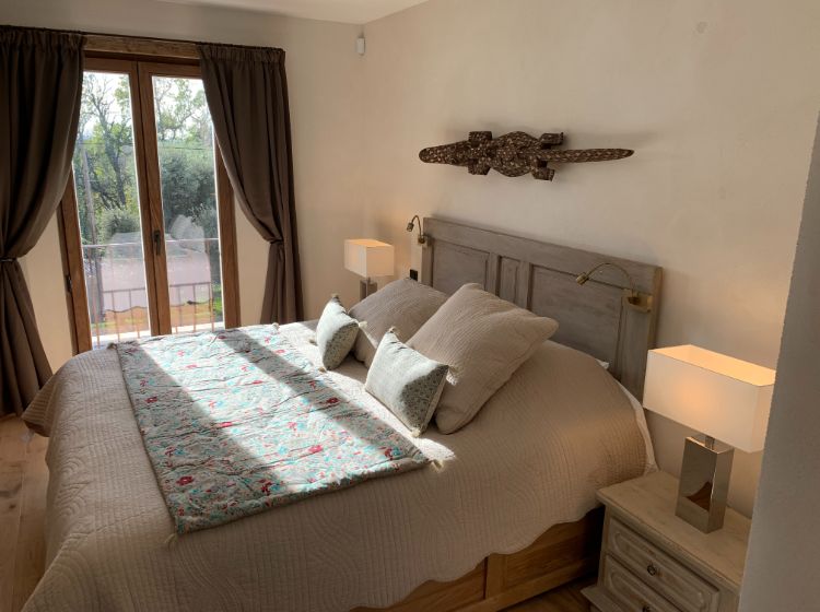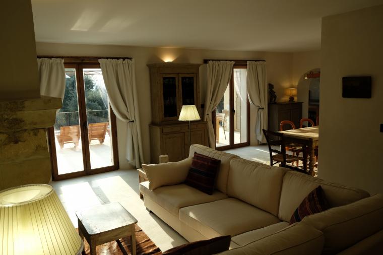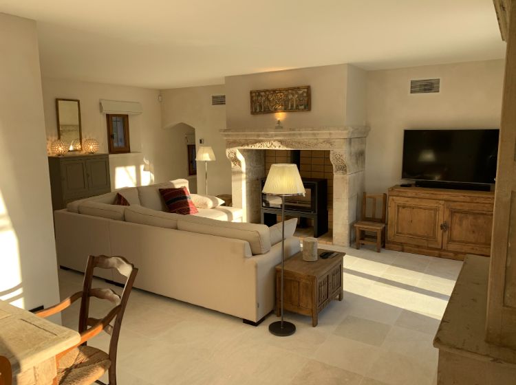 Un hall d’entrée dessert la maison. Les toilettes ‘invités’ donnent directement sur ce hall. Du hall, on accède aussi par une double porte (ancienne) à un grand espace de vie incluant le salon, la salle-à-manger et la cuisine. De grandes portes fenêtres donnent là sur la terrasse. De l’espace de vie on accède par un petit couloir aux suites du rez-de-chaussée. Du hall d’entrée, on peut aussi accéder aux 2 suites de l’étage. Toutes les suites sont équipées d’une salle-de-douche (walk-in) en marbre, de WC, d’un lit de 180 cm (king size), de placards ou armoire et de portes fenêtres donnant sur la piscine et la vallée. 3 des suites sont aussi équipées d’une table ou bureau. De l’étage, on peut apercevoir Cavaillon situé à environ 20 km et les Alpilles!
