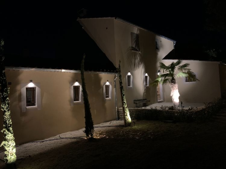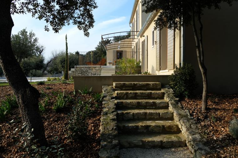 Le jardin paysagé est entièrement aménagé et spacieux. Il est agrémenté des petits chemins et escaliers facilitant la circulation entre les terrasses et espaces verts. On y trouve des partie plane engazonnées, des oliviers et chênes verts et une piste de pétanque.