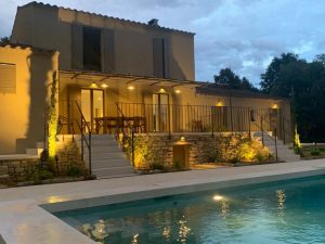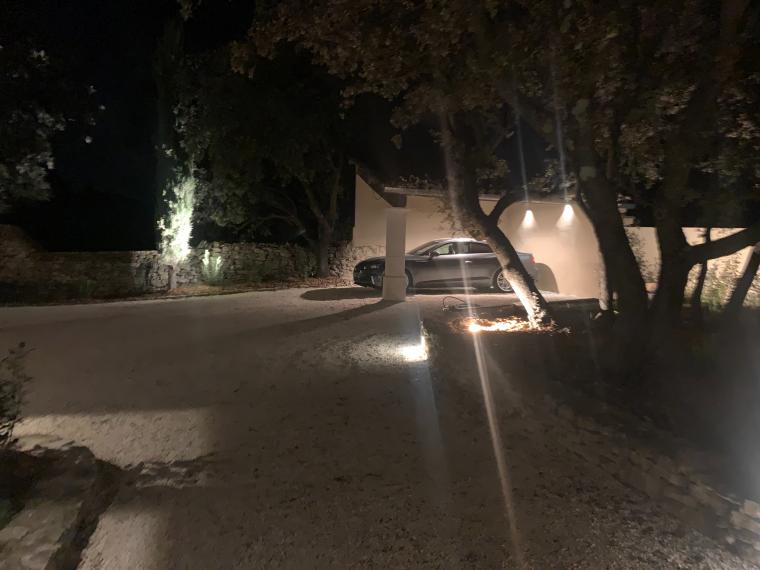 Après avoir passé le portail, on accède à la propriété par une allée longeant la villa, vers l’espace parking incluant un appentis qui permet de garer la voiture à l’abri soleil. Côté jardin, la façade sud-ouest est tournée vers la piscine, les terrasses, le canal et la vallée. Les terrasses y sont nombreuses: 3 grandes (1 couverte au niveau de la cuisine et du séjour / salon, 1 couverte et 1 non couverte autour de la piscine, 2 plus petites terrasses devant les suites du rez-de-chaussée, 1 ombragée près de la piste de pétanque et 1 terrasse de desserte entre la cuisine et la buanderie.