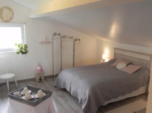 Voir les 9 photosChambre spacieuse de style shabby pensée pour un maximum de commodités : salle de bain en face le lit deux places, repose valises, penderie.