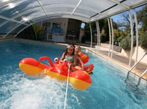L’environnement ombragé et fleuri est à partager. Un trampoline et une cabane sont à disposition des enfants. La piscine de 5m par 10m, possède une plage de 1m de profondeur, le reste du bassin fait 1,50. Un aquabike et une nage à contre courant sont à dispositon des baigneurs ainsi que les transats.