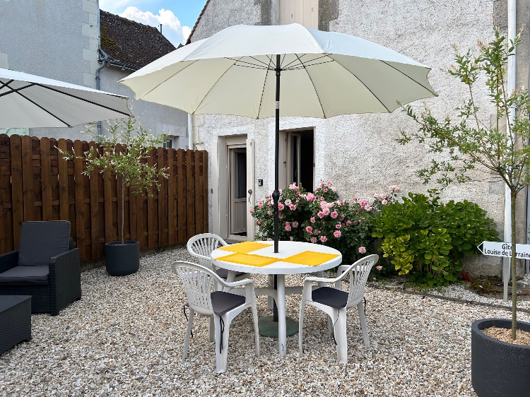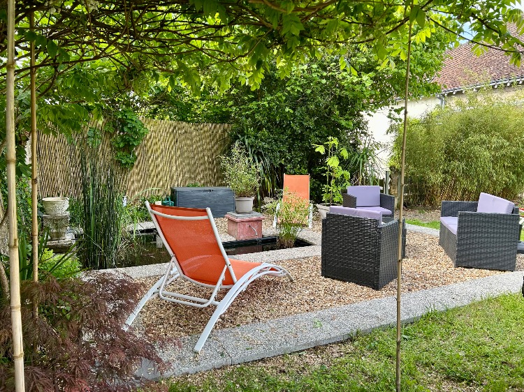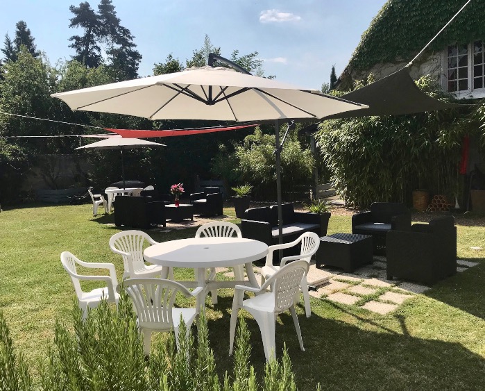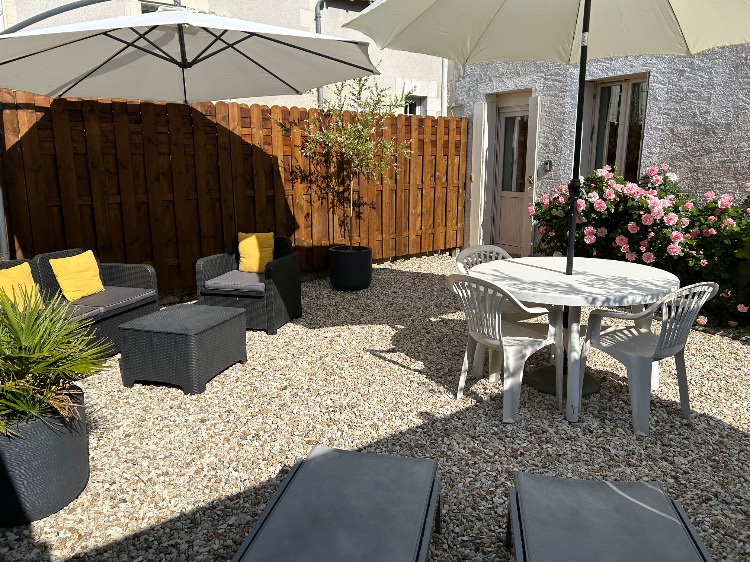 En période estivale, le jardin est équipé de : table, chaises, parasol, bains de soleil et barbecue.