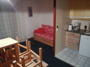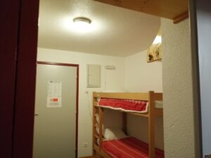 Lits superposés dans l’entrée, pièce de vie avec canapé-lit gigogne (pieds escamotables à déplier pour former lit 2 places), sdb avec baignoire, WC séparé, cuisine équipée (four, plaques, micro-ondes, service à raclette… ), Jeux de société, …