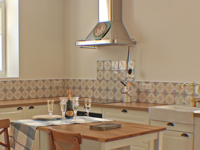 – grande cuisine équipée et son îlot, une grande table à manger et son vaisselier,