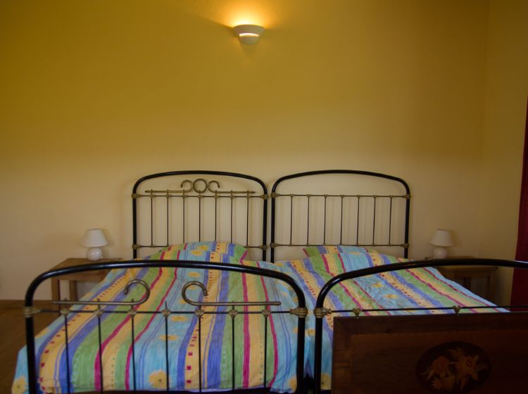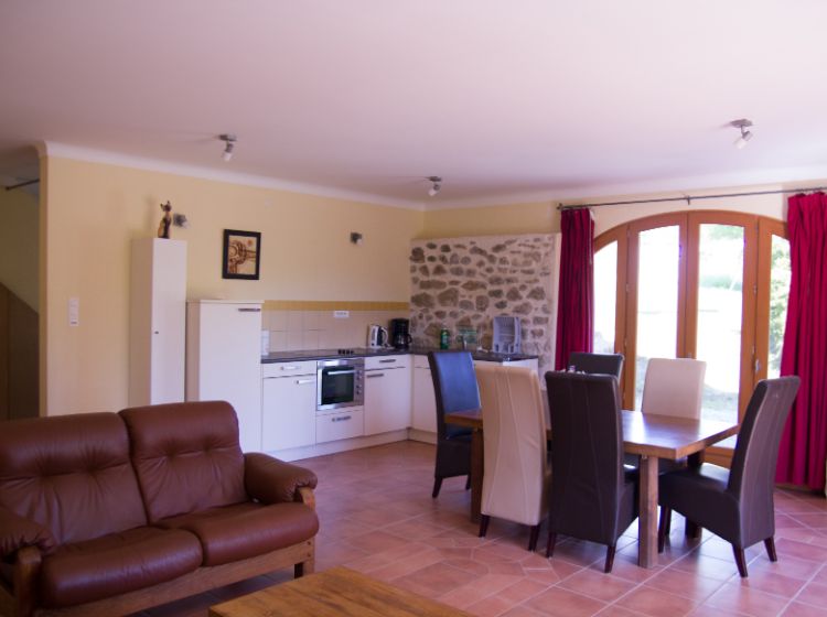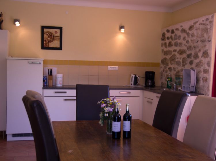 Maison Grenache est une maison spacieuse et lumineuse, avec grande cuisine (équipée de lave-vaisselle, cafetière, grille-pain, plaque cuisson vitrocéramique, four/micro-ondes, frigo avec compartiment congélateur ainsi qu’une table pour 6 personnes. Salon avec des portes voûtées pour accéder à la terrasse par le coté ou par devant. Petite buanderie avec machine à laver. Dans le couloir se trouvent les toilettes et l’escalier vers le 1er étage où vous trouverez 2 chambres avec chacune leur salle de bain (douche, lavabo et toilettes). Une chambre à 2 lits (120 x 200), l’autre à 3 lits (90 x 200).