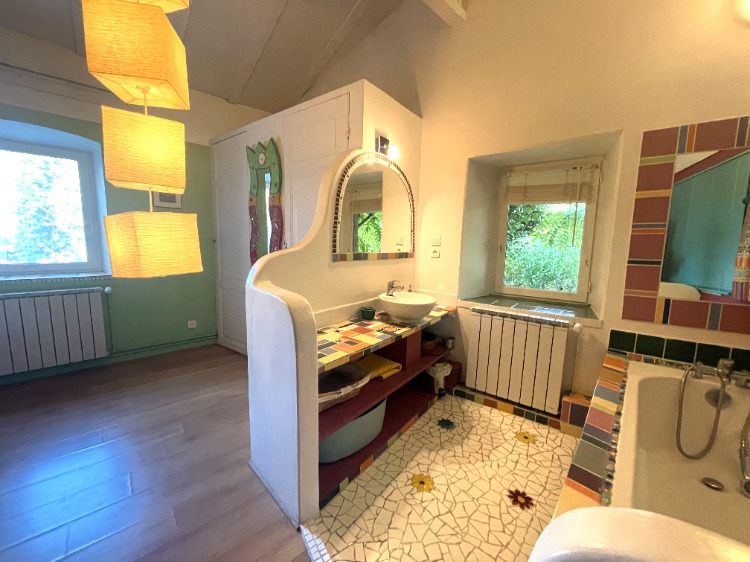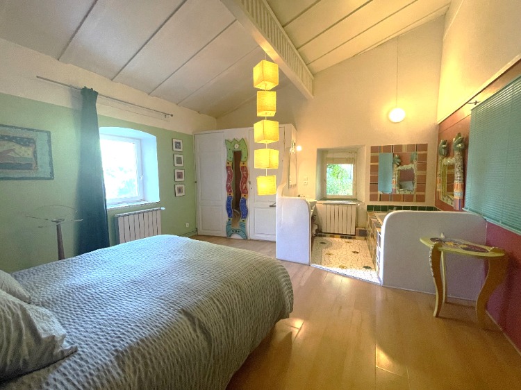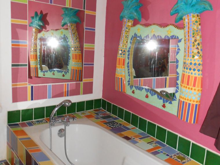 Décoration soignée et colorée, maison d’artiste mosaïste. Nous avons gardé les volumes sous plafond et privilégié l’espace ainsi que le confort, pas de lit clic-clac ,une literie de qualité. 160 cm pour les lits doubles. Bastide avec 3 gîtes indépendants :le gîte ”Sous les étoiles-“: 3 chambres-le gîte ”Octopus” :2 chambres-et le Gîte”COCO”:1 chambre- le tout sur 2ha ,ouverts sur la nature, l’impression d’être isolé à 10 km de Montélimar .La tranquillité des lieux ,sans promiscuité -c’est essentiel pour nous- chacun a son espace privé, le lieu commun étant la piscine ;de grande dimension:7.5 X 12m; avec alarme flottante ,elle est clôturée discrètement afin d’offrir un grand espace de détente avec de nombreux transats de qualité, lieu végétalisé ,il y a des oliviers ,lavandes, romarins…Les enfants se rencontrent à la piscine et souvent ,se lient d’amitié avec l’autre famille. ,Nous sommes à proximité, si besoin!