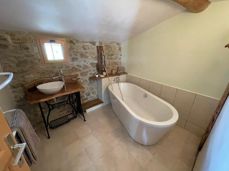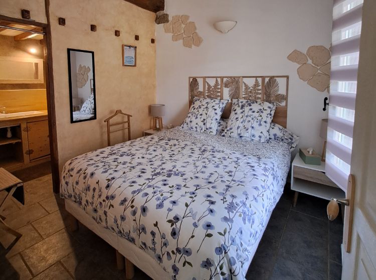 À l’étage, cette chambre cocooning invite au repos avec son lit double (standard), sa baignoire, et sa petite terrasse privée avec vue sur la maison. Un vrai nid douillet pour une pause hors du temps.