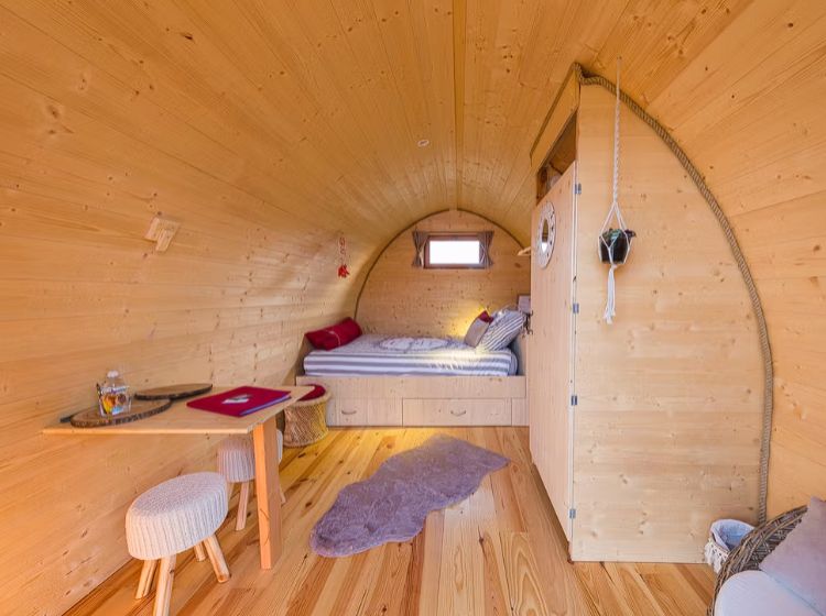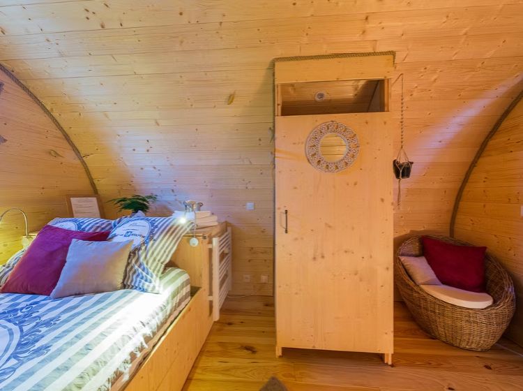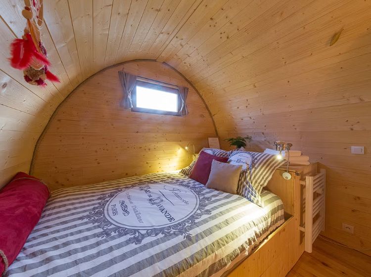 Hébergement insolite fait main, en bois, inspiré des cabanes de bergers anglaises. Ce petit cocon de 12 m² possède un lit double, des toilettes sèches, une terrasse privée et un bloc sanitaire privatif à proximité. Immersion nature garantie !