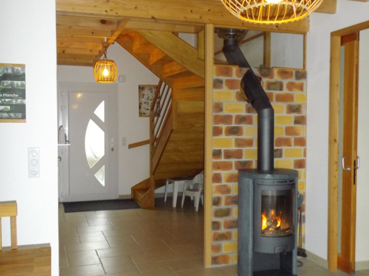 Situé entre le salon et la salle à manger le poêle à bois vous apportera sa douce chaleur et chauffera cette maison en ossature bois qui est très bien isolée.