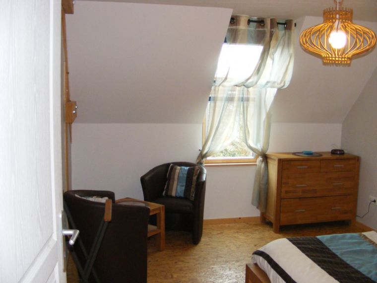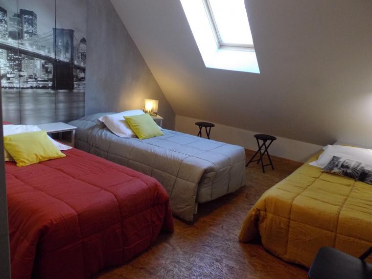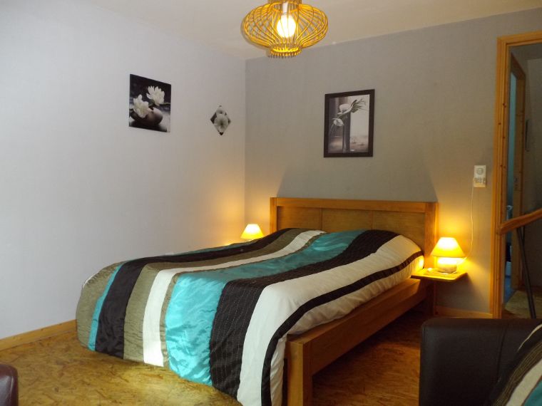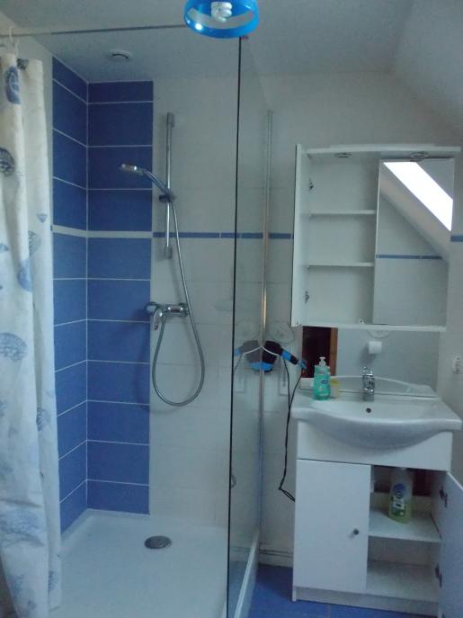 A l’étage, deux chambres, l’une avec un lit double et l’autre avec trois lits simples et une salle d’eau avec un toilette sur la palier une banquette.