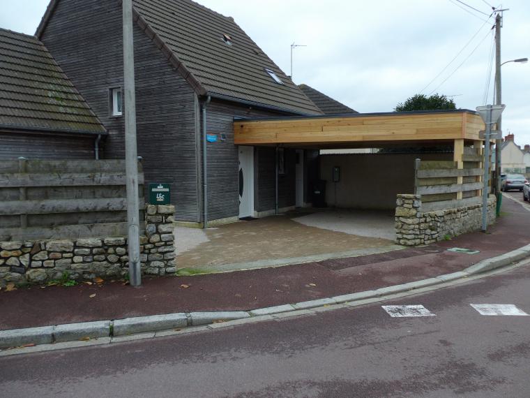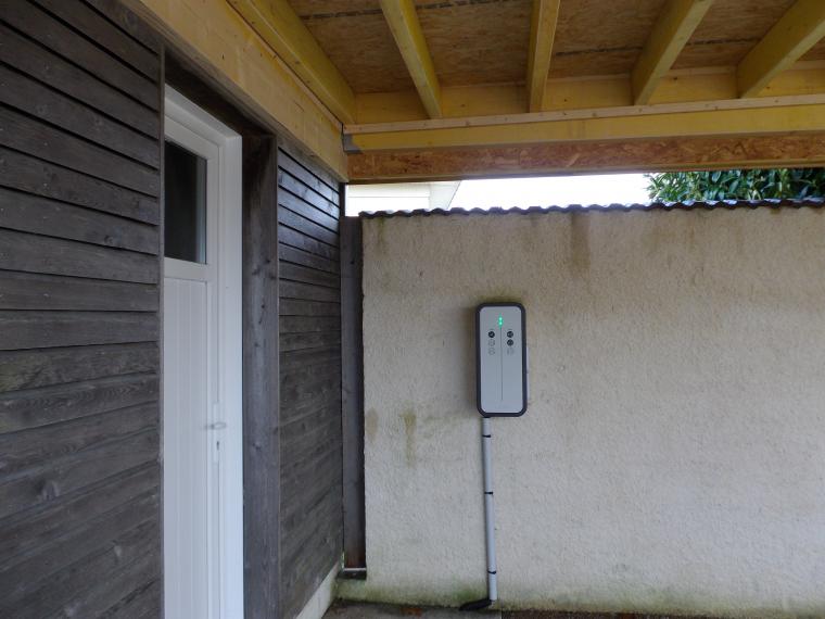 Côté nord, qui donne accès à l’hébergement, vous avez trois places de parking dont deux sous le car-port, avec la borne de recharge pour les voitures éclectiques.