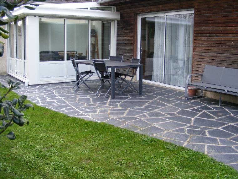 Côté sud, la véranda, le jardin clos avec une grande terrasse aménagée pour le repas avec barbecue, des fauteuils et un parasol.