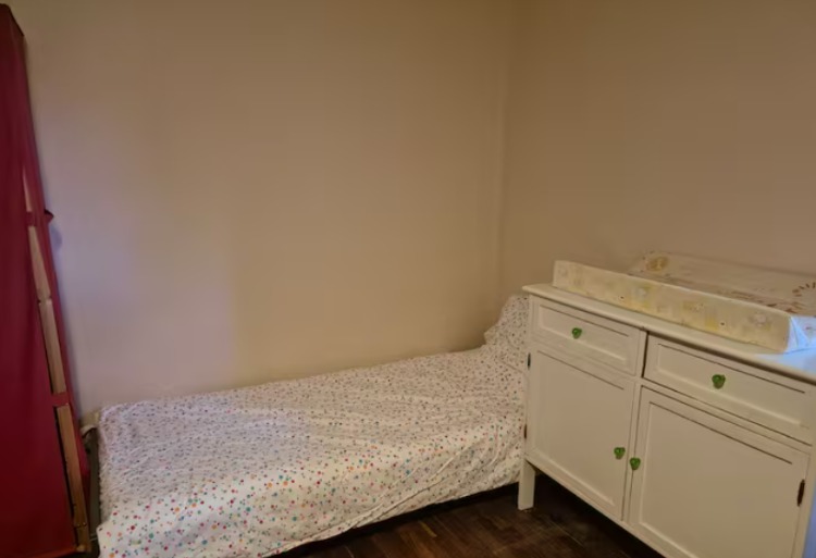 Une chambre avec un lit queen size, une grande chambre avec 3 lits une personne.
