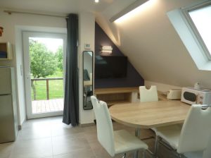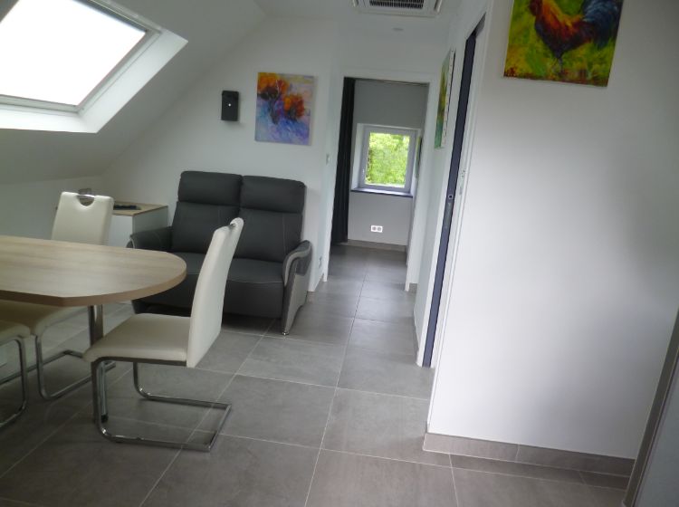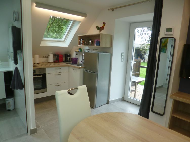 Voir les 11 photosDans l’étage surplombant et isolant l’ancienne cave à cidre ,un aménagement très étudié et contemporain a permis de créer ,sur 35 m2 un gîte adapté à 2adultes et 1 jeune et comprenant :