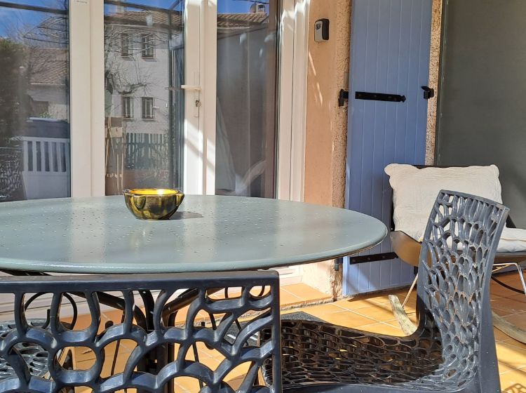 Jardinet. Terrasse privative avec panneau plein de séparation entre les deux locations. Table et sièges. Boîte à clé privative.