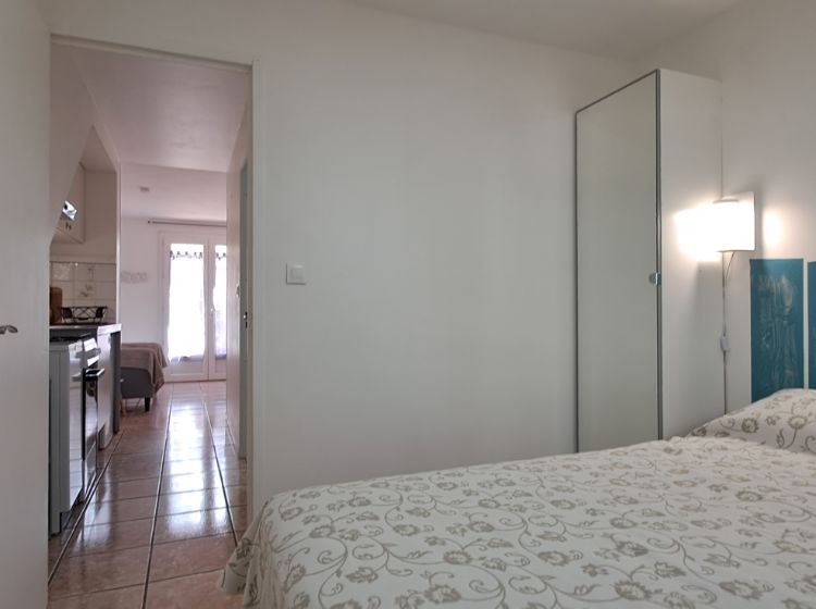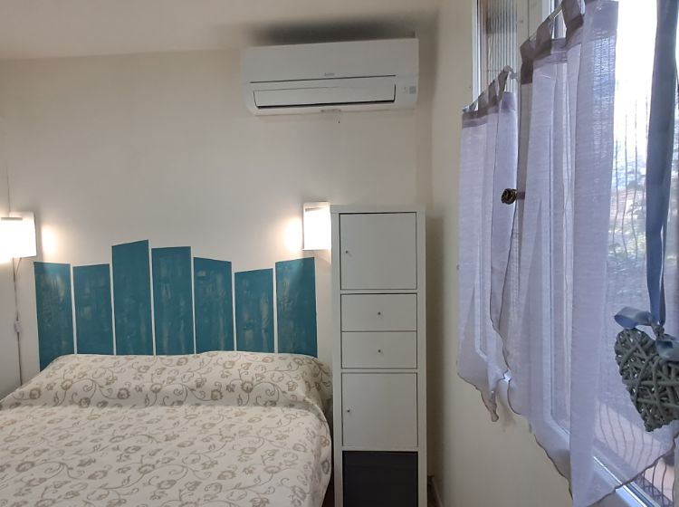 Chambre: climatisation réversible, lit en 160cm, 2 oreillers, 2 couvertures, étagères de rangement et penderie.