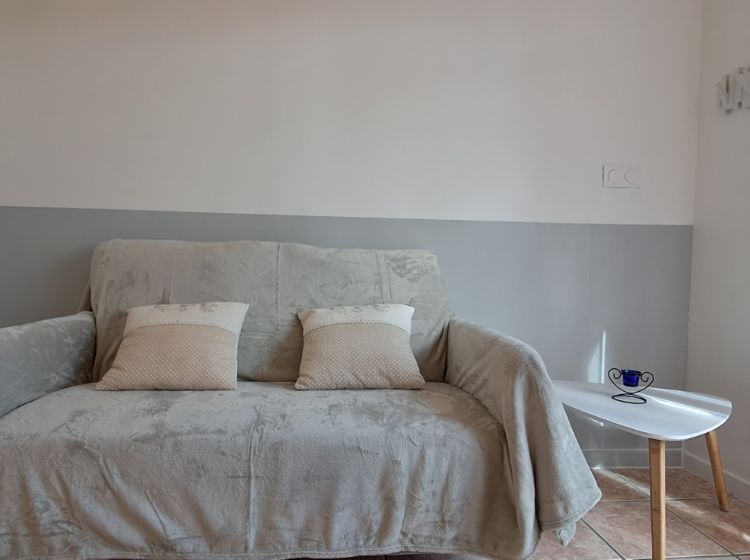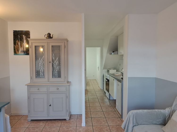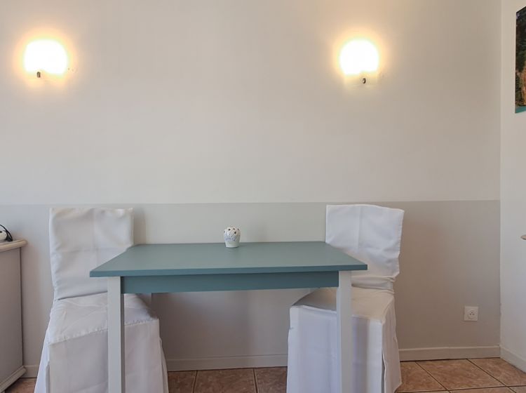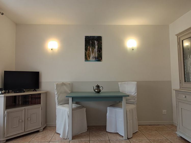 Séjour/coin repas: canapé 2 places, meuble rangement vaisselle, table et 2 chaises, TV parabole TNTSAT.