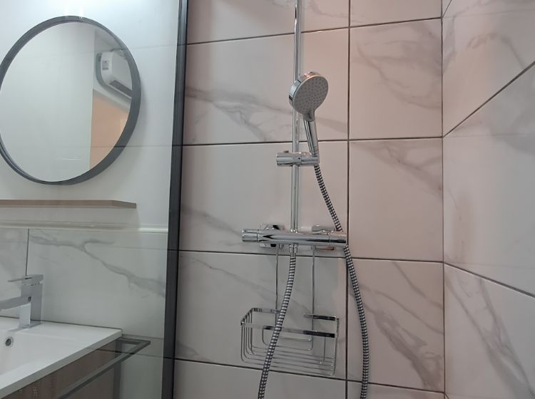 Salle de bains ou salle d’eau: douche 80 x 140 cm, meuble vasque avec rangement, miroir, sèche cheveux, chauffage soufflant.