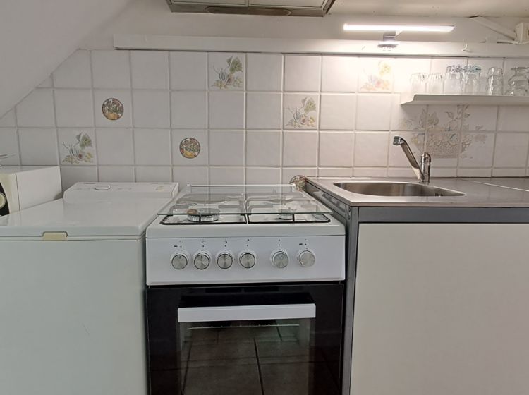 Coin cuisine: réfrigérateur avec freezer, évier, gazinière (bouteille gaz) avec four électrique, machine à laver linge, hotte, micro-ondes. Vaisselle, casseroles, fait-tout, poêle, cafetière (filtre papier), grille pain, bouilloire, presse agrume, petit robot de cuisine, poubelle.