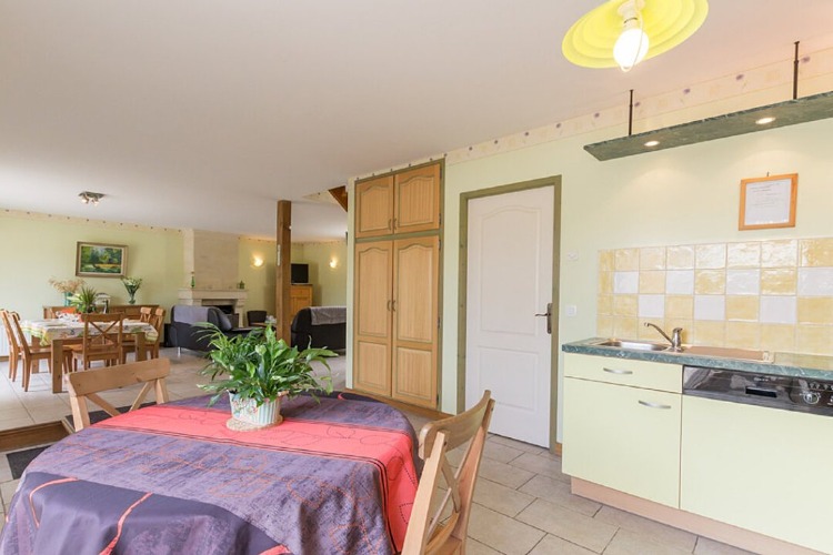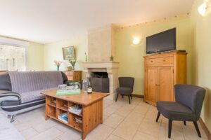 Gîte indépendant, mitoyen au gîte n°2901, proche de l’habitation du propriétaire. Rez-de-chaussée : séjour avec espace salon (canapé, fauteuils et cheminée) et espace cuisine (cafetière Nespresso), salle d’eau, WC. Étage (mansardé) : 4 chambres (4 lits 1 personne : 90×200), salle d’eau, WC. Cour aménagée avec terrasse bois et 2 tables de pique-nique. Cour privative au gite.
