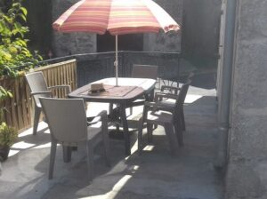 Cette terrasse est équipée d’ un salon de jardin, un parasol, des chaises longues et un barbecue charbon de bois. Une petite pièce de 5 m2 au fond de la terrasse est un plus pour le rangement.