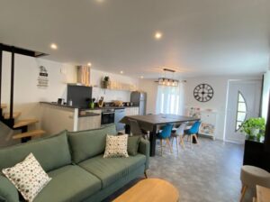 Une pièce à vivre avec une grande cuisine toute équipée.