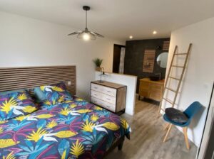 Une grande chambre avec un lit double en 160 et un lit cabane 1 place pour les enfants en quête d’aventure. Un grand dressing pour ranger toutes vos valises…