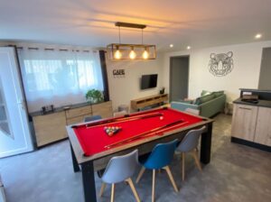 Un petit salon avec table basse et télévision et une table à manger convertible en billard pour les amateurs…