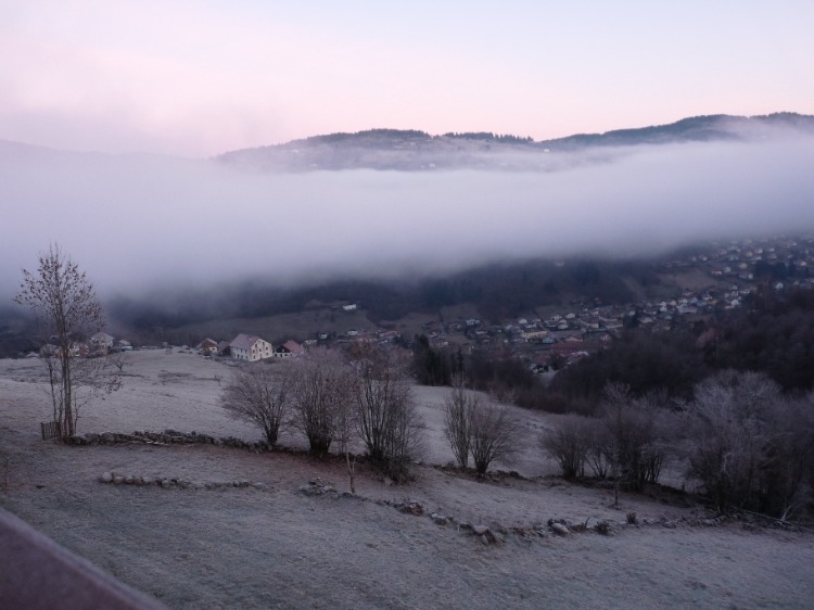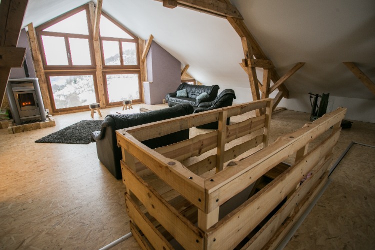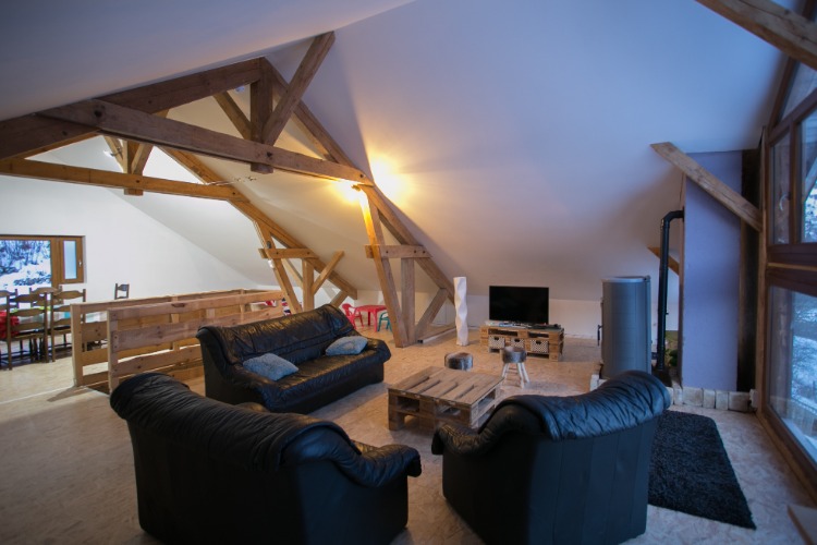 Ancien grenier transformé en salon / coin détente de plus de 100 m² comprenant : canapés, fauteuil, tabourets, TV – DVD, table de ferme, jeux de société, coin jeux enfants, poêle à pellet. Grandes baies vitrées donnant sur la vallée Bressaude.