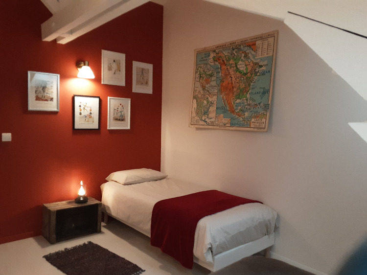 – 1 chambre avec lit simple (90 x 200) et lit bébé en bois,