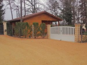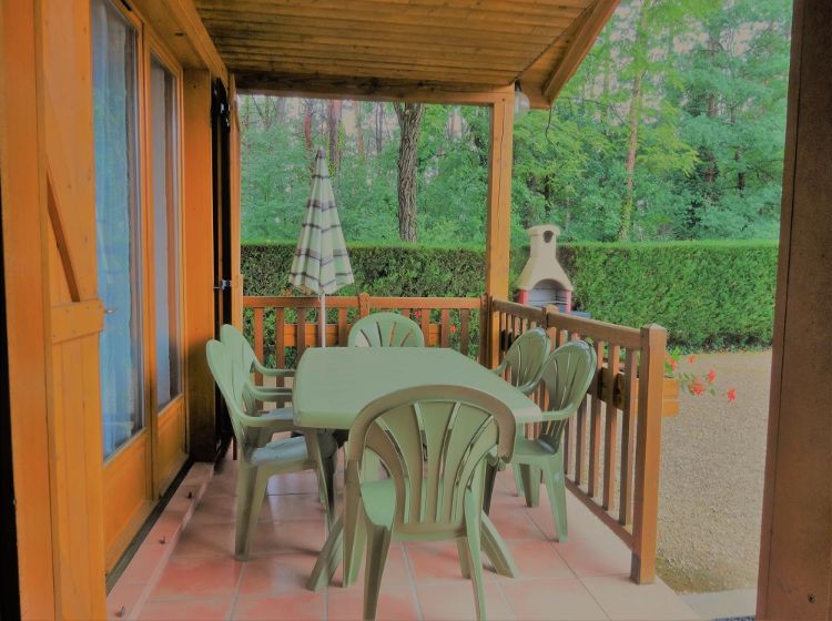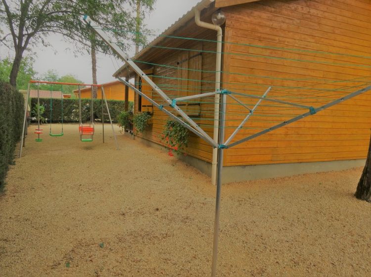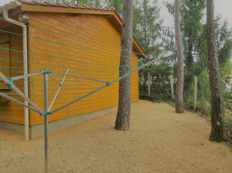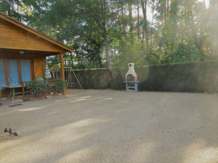 -COUR: 150 m environ, gravillonnée autour du chalet; clos avec portail, Parking privé, Parapluie à linge, Portique pour enfants, Barbecue.