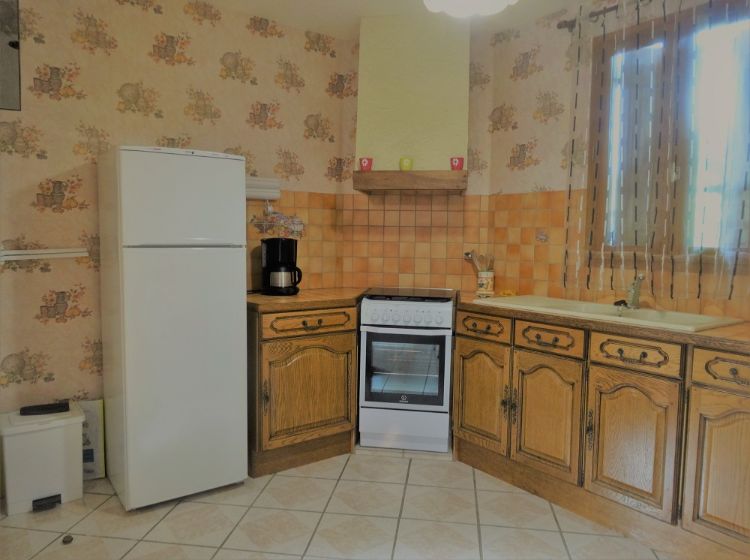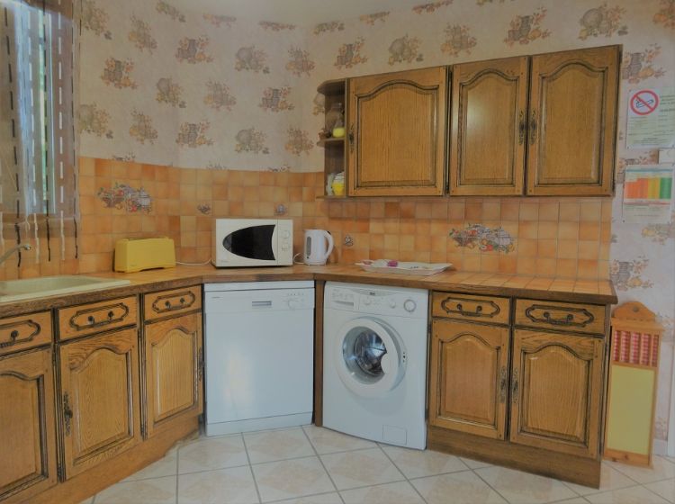 -CUISINE: 10m, comprend. Réfrigérateur-Congélateur, Cuisinière 3 feux gaz propane, 1 plaque chauffante électrique, Four électrique, Hotte aspirante, Micro-ondes, Lave-linge, Lave-vaisselle, Grille-pain, Cafetière électrique, Plan de travail 2m environ, Évier 2 bacs 1 égouttoir, Cuisine encastrée avec assortiment de vaisselle 12 couverts. 1 Fenêtre et 1 Porte d’entrée vitrée.
