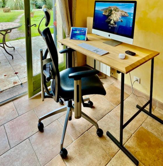 Depuis le début de la pandémie de Covid nous avons ajouté un plateau en bois massif et 2 solides tréteaux en acier que vous pourrez installer où vous voulez : sur la terrasse, dans le séjour ou même dans la chambre. Une box 4G très haut débit (60 Mb/s) autorise tous les transferts de fichier et toutes les conférences vidéos.
