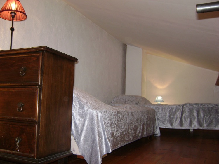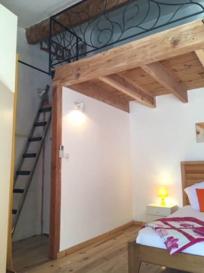 ainsi qu’une mezzanine ouverte avec deux lit simples, commode à tiroirs , table et lumières ainsi qu’une petite penderie mural .