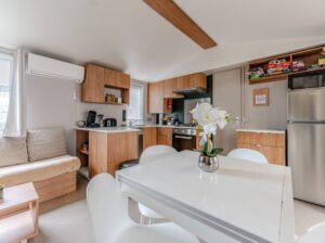 Voir les 20 photosLe mobil-home haut de gamme climatisé est composé de 3 chambres et de 2 salles d’eau avec une terrasse entièrement couverte d’une capacité de 8 personnes max.