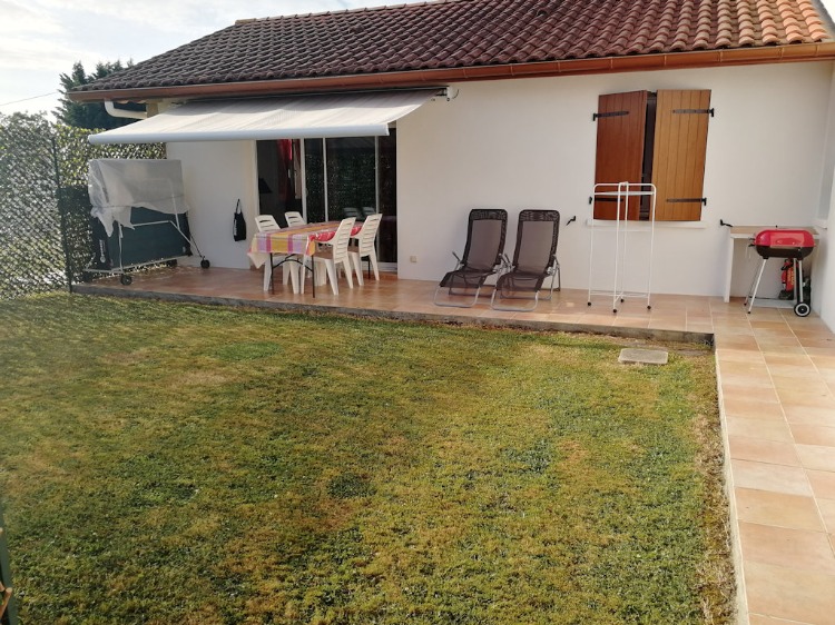 – une terrasse, avec coin jardin, équipée d’un store électrique, de table et chaises, transats, parasol, barbecue.