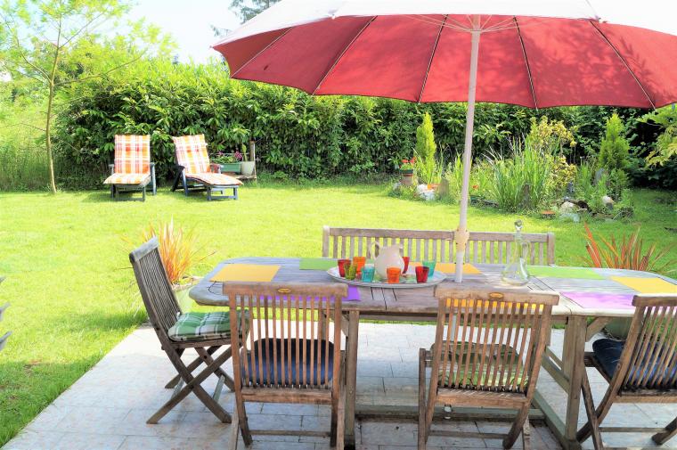 Jardin exposé sud avec terrasse et salon de jardin-le terrain est clos pour la sécurité des enfants et des animaux.