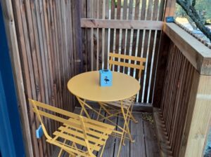 Salon de jardin et table extérieure avec parasol pour pouvoir déjeuner a l extérieur.