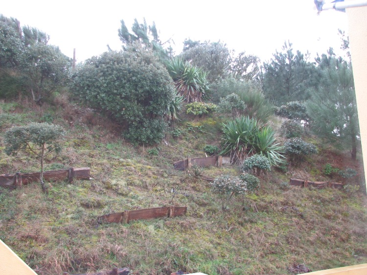 Devant la maison, la baie vitrée du salon, la porte d’entrée et la fenêtre d’une chambre ouvrent sur une cour en pelouse en partie arborée en orientation ouest, sur cette terrasse une douche solaire, un évier extérieur, une table et un banc.