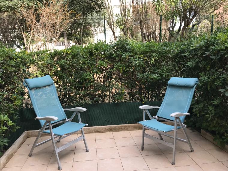 La terrasse en rez de jardin (15 m2), donnant sur un parc ombragé, est équipée d’une table, chaises, 2 fauteuils relax, 1 parasol ainsi que d’un coin pour étendre le linge. La terrasse est close par un grillage et de petits arbustes. Celle-ci est éclairée par une lampe extérieure