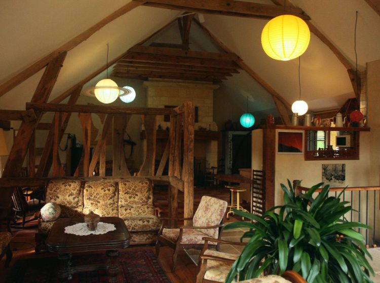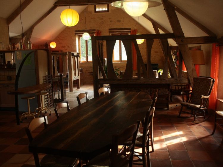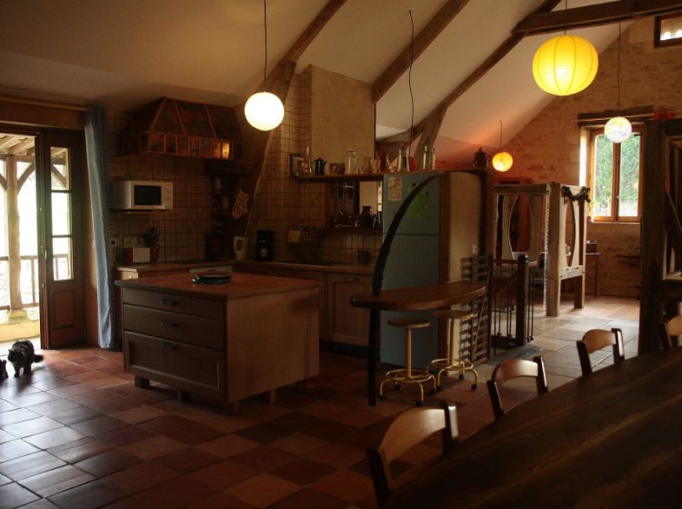 A l’étage le vaste grenier est désormais un lieu de vie lumineux où se côtoient un salon avec la télévision, un bureau et un bon réseau Wifi ( fibre ), une salle à manger et une grande table devant une cheminée et poêle à bois, une cuisine bien équipée avec four et plaque à induction.